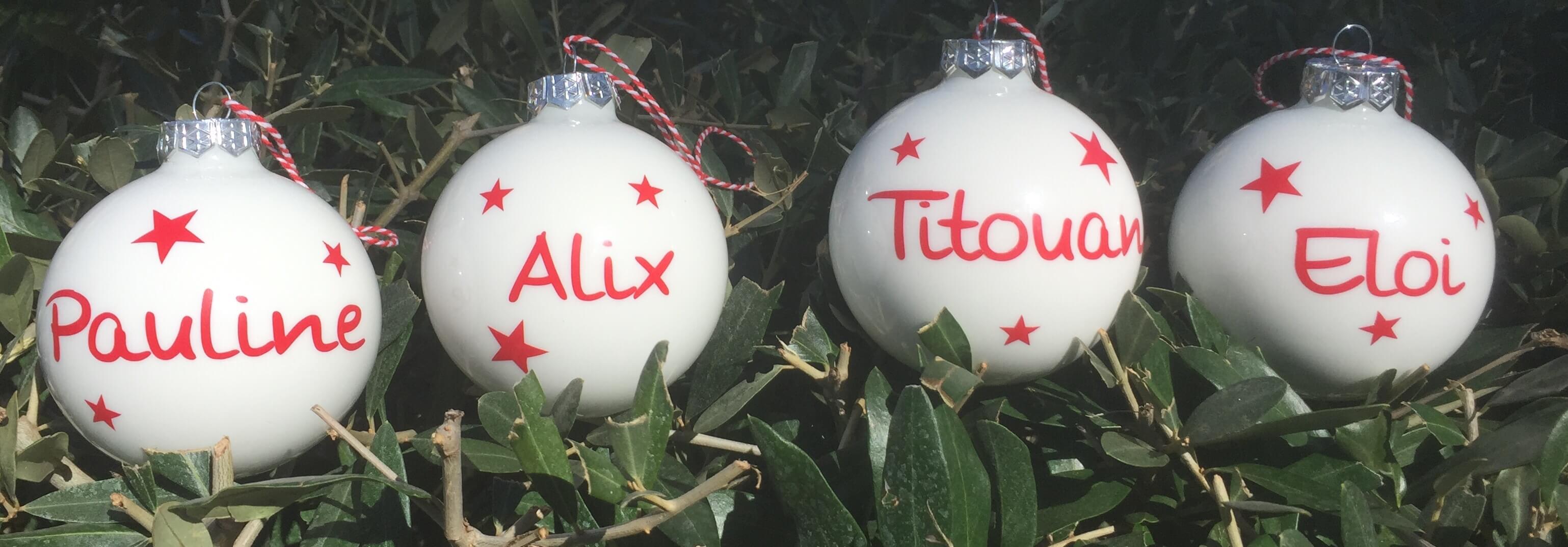 J’adore ces boules de Noël couleur blanc opale, en verre. Elles sont personnalisables à l’infini grâce au vinyle. Elles sont ornementées d’une suspension argent et d’un petit cordon assorti au vinyle. 3 petites étoiles accompagnent le prénom ou le message.